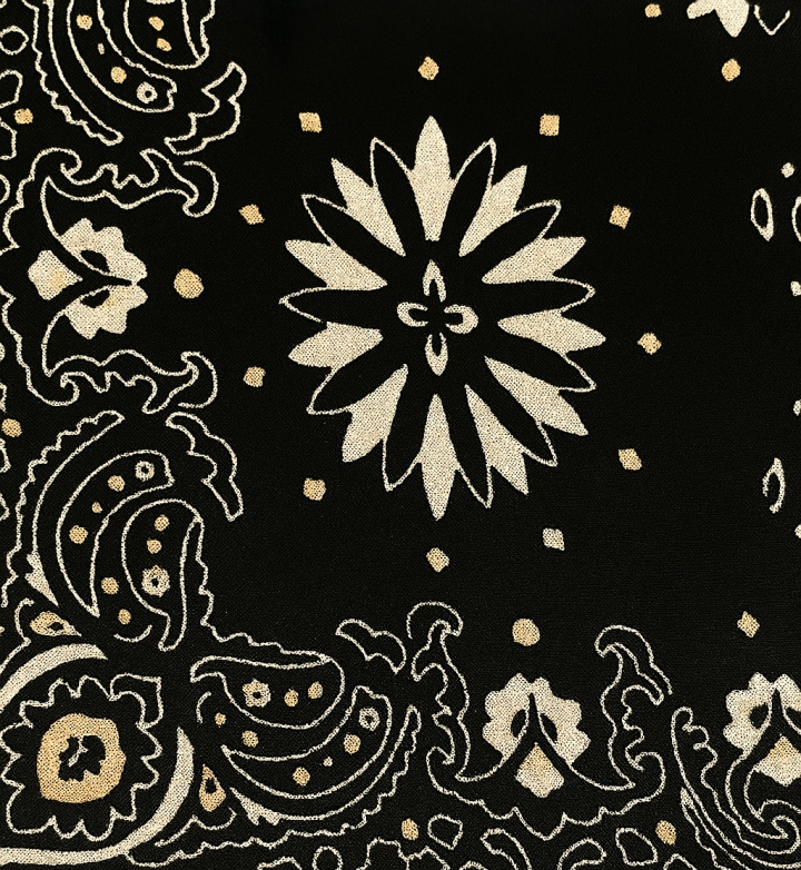 Elyaf Viscon ve Floş karışımı kumaş siyah zemin üzerinde altın ve krem desenler. Şık, zarif ve çok yönlü kullanım için ideal kumaş.
