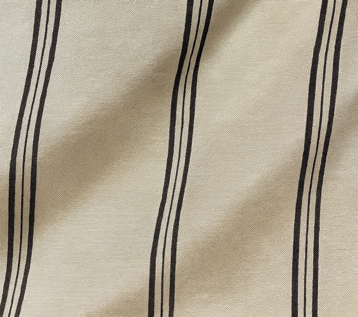 Viscon ve Coton karışımı krem zemin üzerinde siyah ince çizgilerden oluşan minimalist kumaş. Modern giyim için çok yönlü kullanıma ideal.