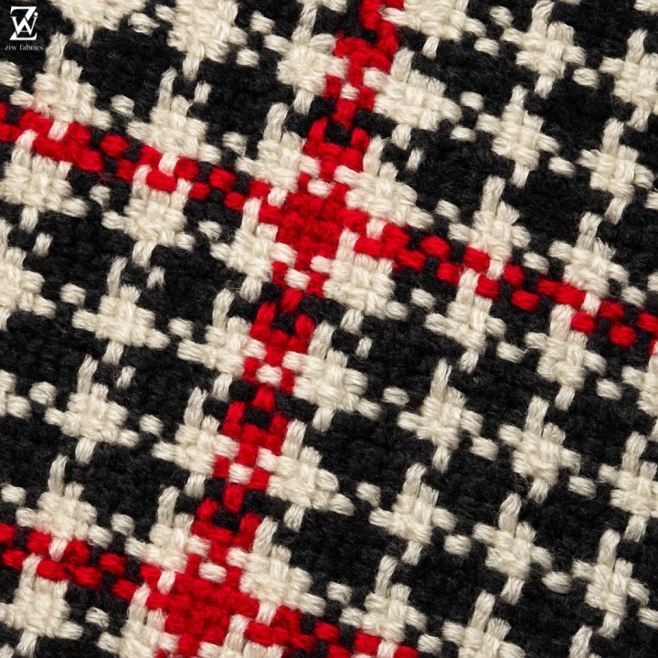 Siyah, beyaz ve kırmızının uyumlu birleşiminden oluşan kalın dokulu polyester kumaş. Zamansız şıklığıyla giyim alanında kullanım için ideal.